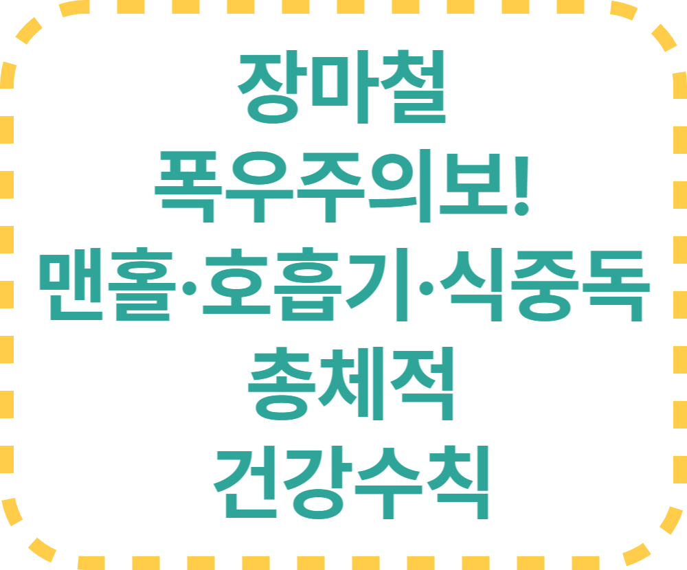 6월 20일부터 전국에 강한 장맛비가 예보되며, 시간당 84mm까지 내릴 가능성도 있습니다. 기상청은 맨홀 뚜껑이 수압으로 열릴 수 있다며 “블랙홀 주의보”를 발령했는데요. 동시에, 고온다습한 환경에서는 호흡기와 소화기 건강도 위협받게 됩니다. 오늘은 맨홀 사고 예방과 호흡기 질환·식중독 등 장마철 대표 위험 요소별 건강 수칙을 정리했습니다.