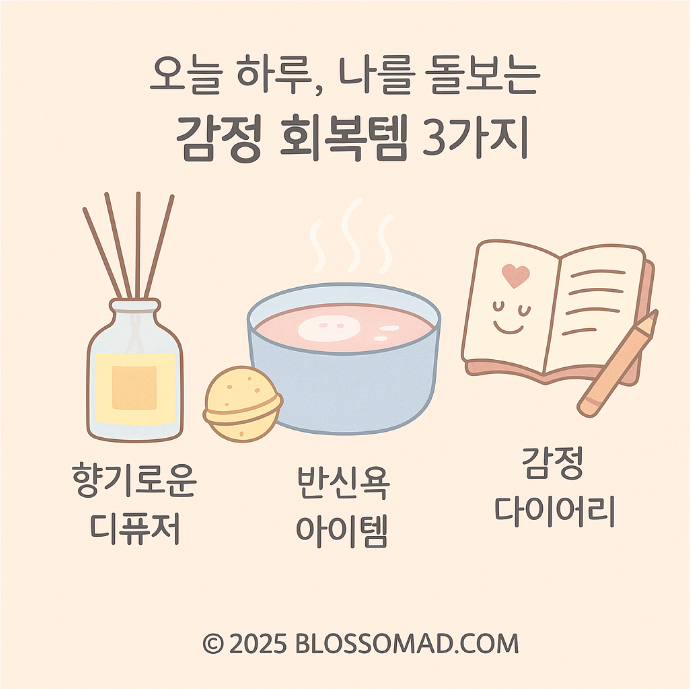 오늘은 집에서 간단히 실천할 수 있는 감정 회복 루틴 아이템 3가지를 소개할게요.