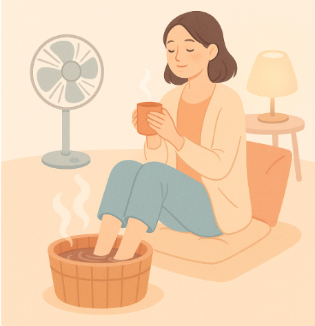 냉방병은 밤 사이 체온이 떨어지면서 증상이 심해집니다. 자기 전 간단한 족욕이나 반신욕은 혈액 순환을 도와 체온을 자연스럽게 올려주고 숙면에도 도움이 됩니다.